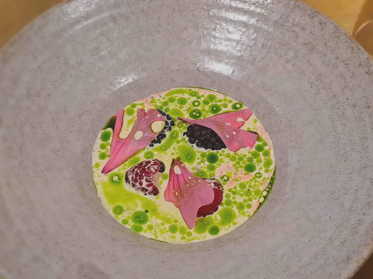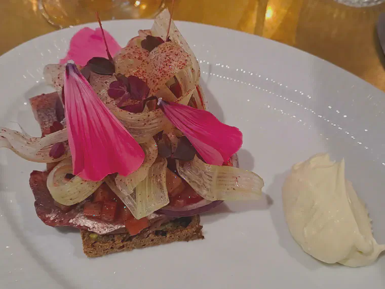 I started with smørrebrød, this one with pickled herring, rhubarb, some cream, and various flowers, vegetables, and herbs.