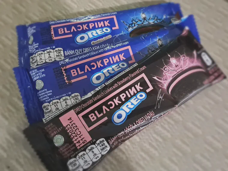 I saw BLɅϽKPIИK oreos at the store a few weeks ago, and bought a roll of the chocolate cookie with strawberry cream flavor. At the time of that purchase, I did not realize there were actually multiple flavors.